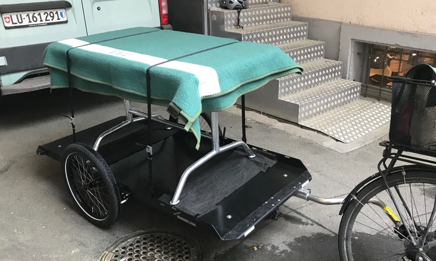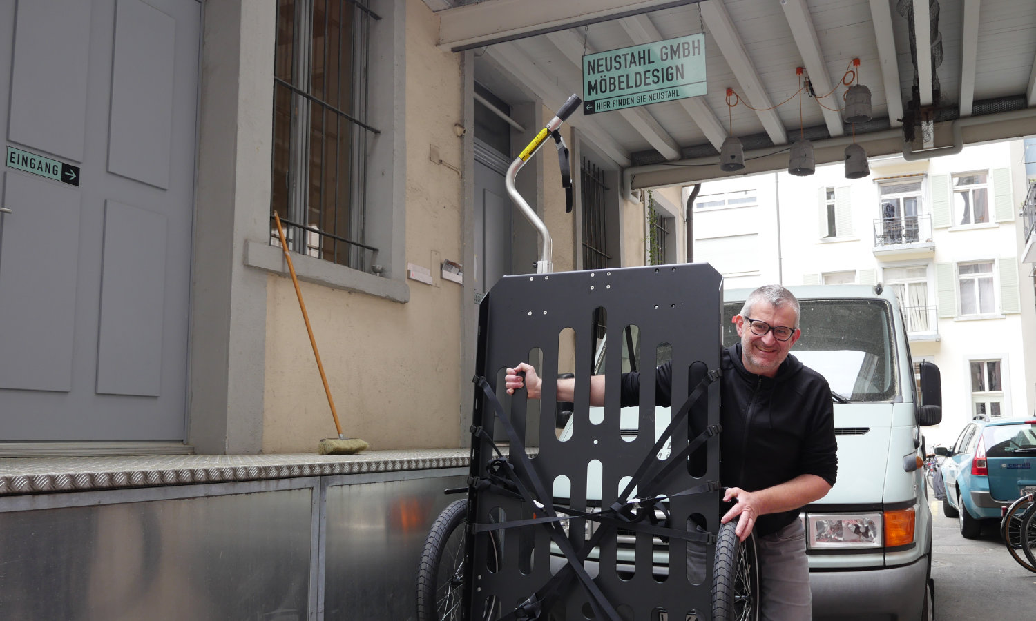 Wie bringt man neu bestellte Möbel am besten zu ihren neuen Besitzer*innen? Hanspeter Meyer von Design-Möbel Neustahl macht dies neuerdings mit E-Bike und Anhänger. Er war es leid, für die Fahrten von der Neustadt in das restliche Stadtgebiet und die Agglomeration immer den Bus packen zu müssen. Dafür hat er den grössten Anhänger unseres Anhänger-Bauers Hinterher in München ausgesucht. Dieser wurde ursprünglich für den Transport von Velos konstruiert, eignet sich aber auch für Tische, Bette, Sessel, Stühle, Lampen und Regale bestens.Das scheint fürs Erste etwas unkonventionell. Wie sich nach den ersten Wochen Praxis zeigt, ist es aber vor allem effizient, schnell, und - wie Hanspeter Meyer von Neustahl zu erzählen weiss - auch überaus sympathisch, so bei den Kunden vor zu fahren.
