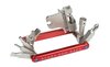 Farbe: redWerkzeug mit 16 Funktionen. Diese sind ein Innensechskant 2/ 3/ 4/ 5/ 6/ 8, ein Rundinnensechskant 25, ein Philips 2, ein Schlitzschraubenzieher, ein Speichenschlüssel 13/ 14/ 15/ 16G und Mavic Spline, ein Kettennieter und ein Flaschenöffner.