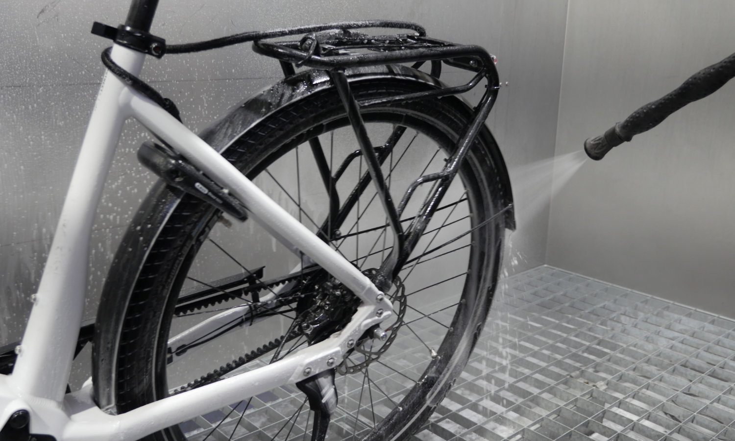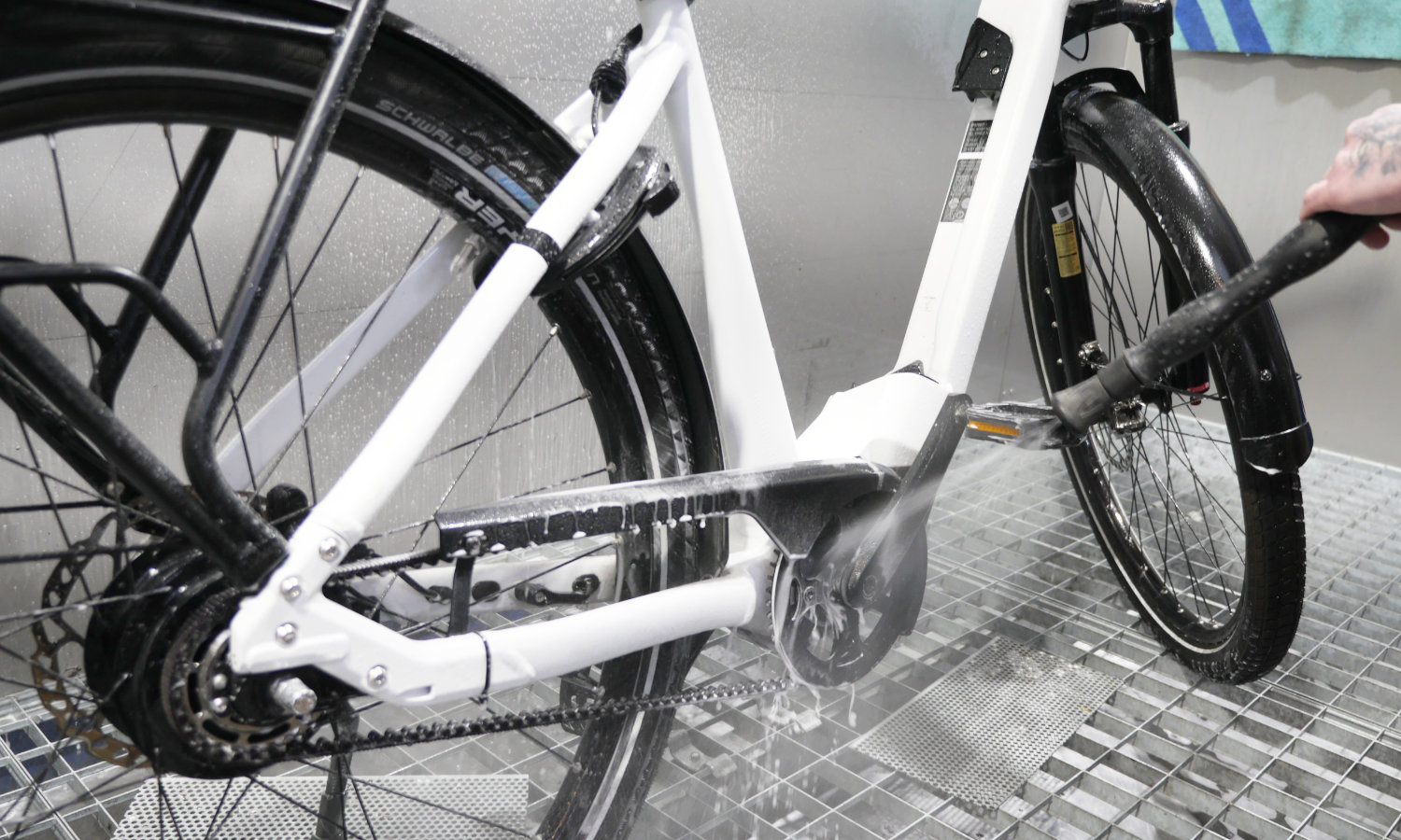 Zum Reinigen werden die Velos erst beidseitig mit warmem Reinigungsmittel-Wasser-Gemisch eingesprüht. Die spezielle Reinigungsdüse sorgt für geringen Wasserverbrauch, und dass das Wasser nur mit leichtem Druck auf das Velo kommt, damit die Lager und elektronischen Bauteile verschont bleiben.