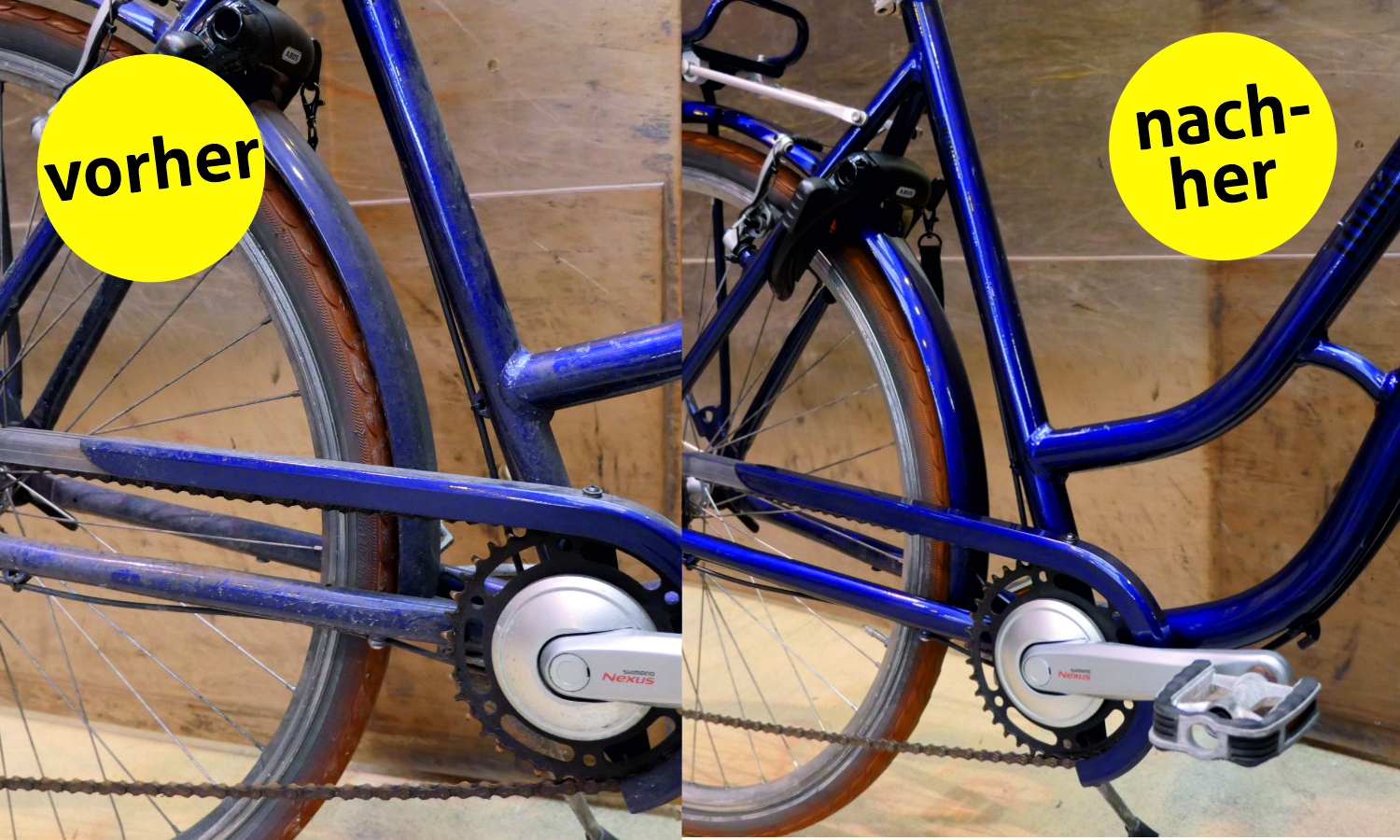 Nach kurzer Einwirkzeit putzen wir das Velo in sorgfältiger