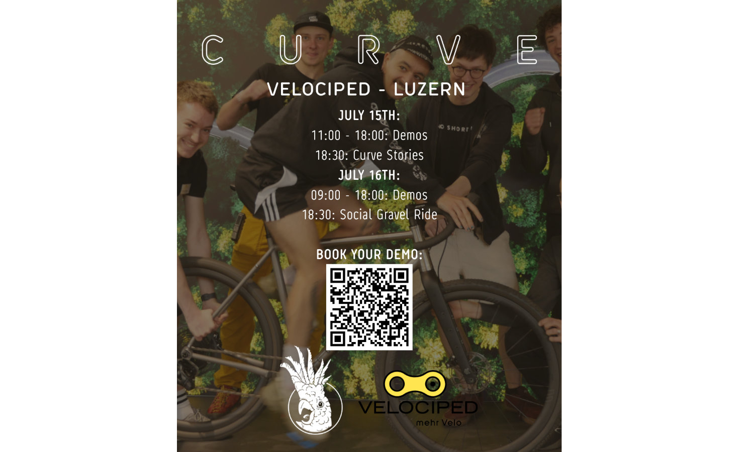 Am 15. & 16. Juli ist Curve bei uns zu Gast. Sie kommen mit 20 Testvelos in allen Grössen von XS bis XXL und machen dir das Velo für eine stündige Testfahrt bereit.