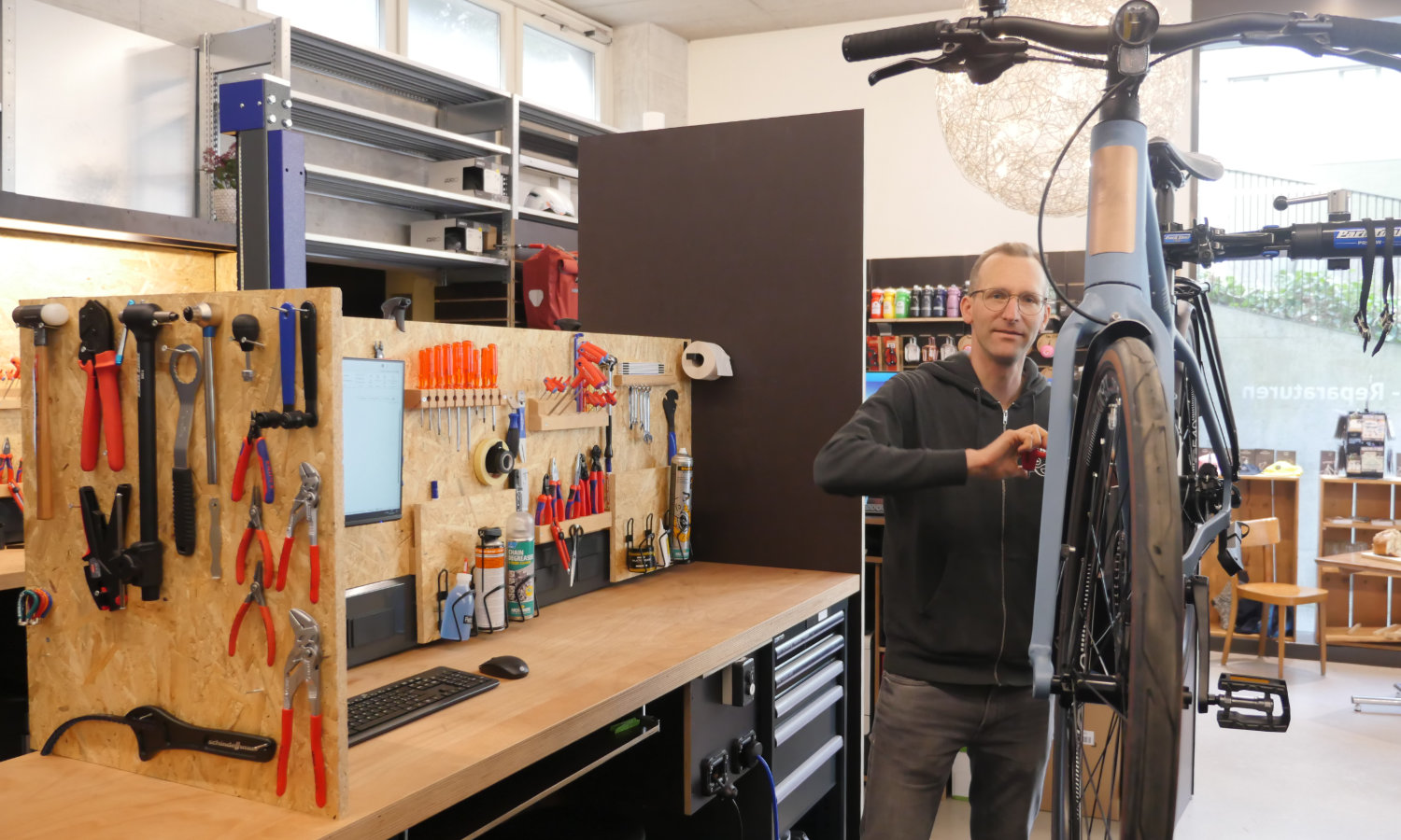 Und natürlich führen wir dort eine Werkstatt: An zwei modern eingerichteten Arbeitsplätzen führen wir Reparaturen und Services an E-Bikes und Velos durch. Da die Werkstatt klein ist und nicht viel Lagerkapazität vorhanden ist, machen wir dort vor allem kleine, schnelle Aufträge. Komme einfach vorbei oder buche deinen Reparatur-Termin online. Bei umfangreichen Reparaturen und Services fungiert der Standort als Annahmestelle für die grosse Werkstatt in Kriens, bei Bedarf kann der Velotransport-Service in Anspruch genommen werden.
