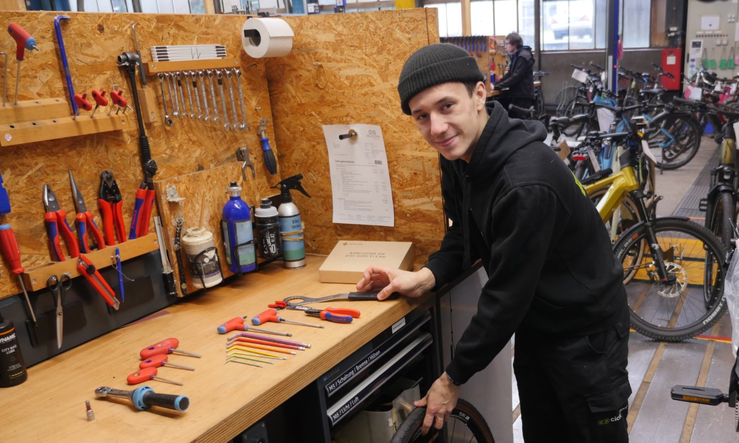 Die erste Woche wird Cedirc von Cedric betreuzt, da lernt er nicht nur Velotechnik sonder auch etwas französisch. Nächste Woche gehts in die Reparaturwerkstatt ud dann noch in den Ladenn.